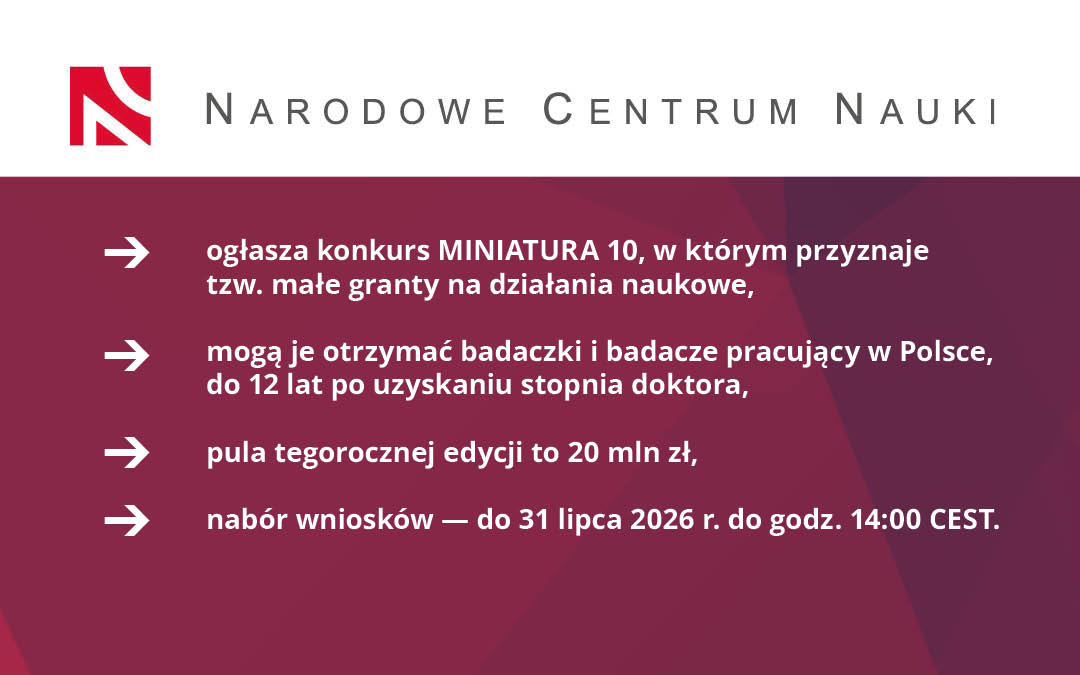 NARODOWE CENTRUM NAUKI ogłasza konkurs MINIATURA 10, w którym są przyznawane małe granty na działania naukowe. Mogą je otrzymać badaczki i badacze pracujący w Polsce, do 12 lat po uzyskaniu stopnia doktora. Pula tegorocznej edycji to 20 mln zł.
